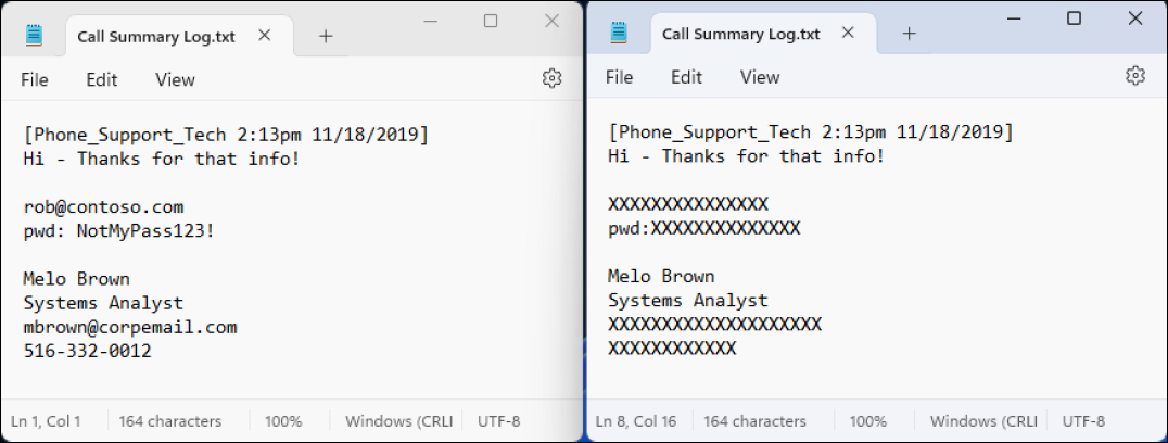 - Redact - Replace numerical and alpha characters in data with generic characters such as 'X' or '#'