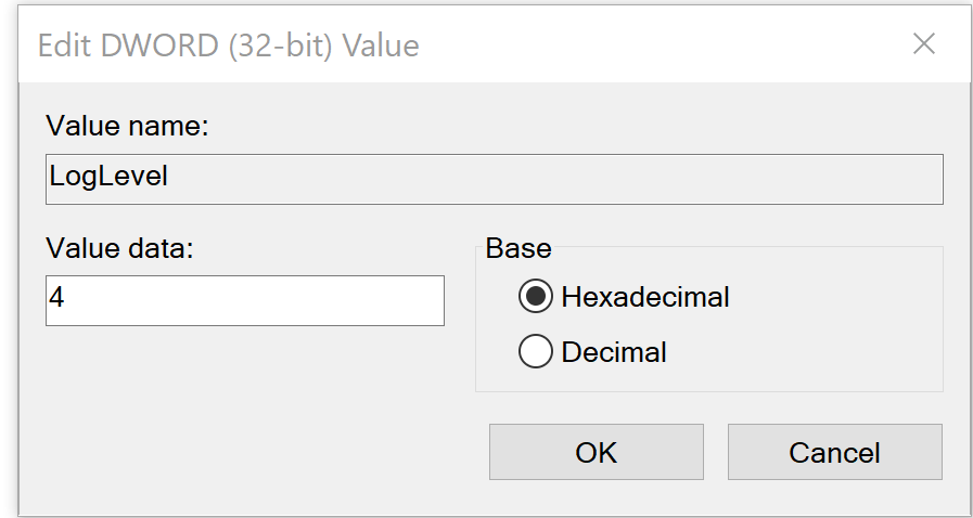 - Enter "4" in the field Value data and click the OK button. Values for all levels of logging are as follows: