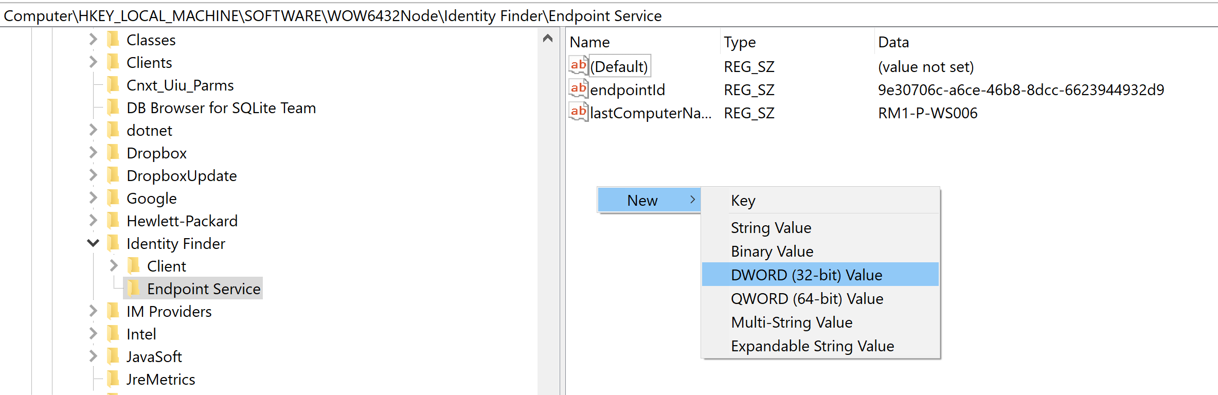 HKEY_LOCAL_MACHINE\SOFTWARE\Wow6432Node\Identity Finder\Endpoint Services - In the right side pane right-click in space and from the sub-menu that appears perform the following steps:
