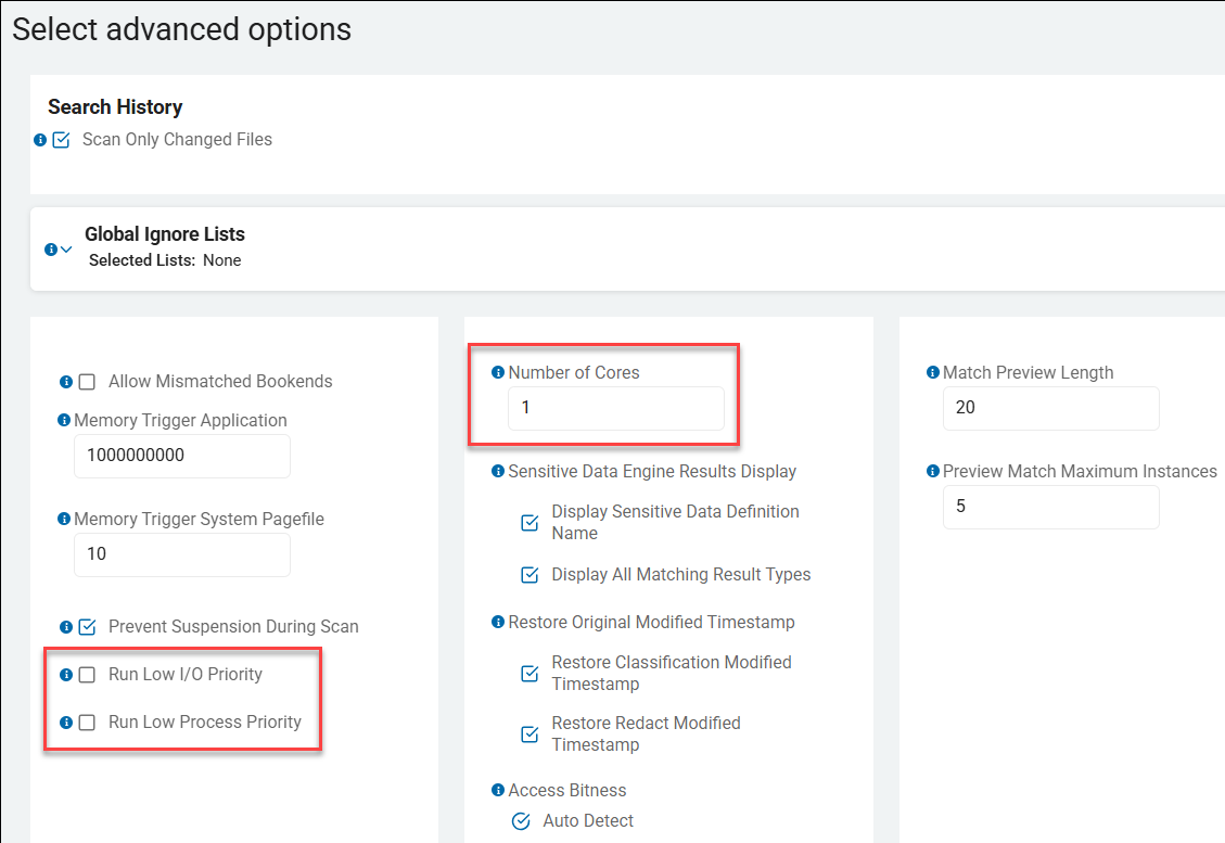 There are 2 distinct "low priority" settings available to ensure the scan does not negatively impact the end-user's experience, and 1 CPU setting. These settings are found on the approximately the 10th screen in the Create New (or Edit) Scan wizard on the "All Scans" page in Spirion Sensitive Data Platform.