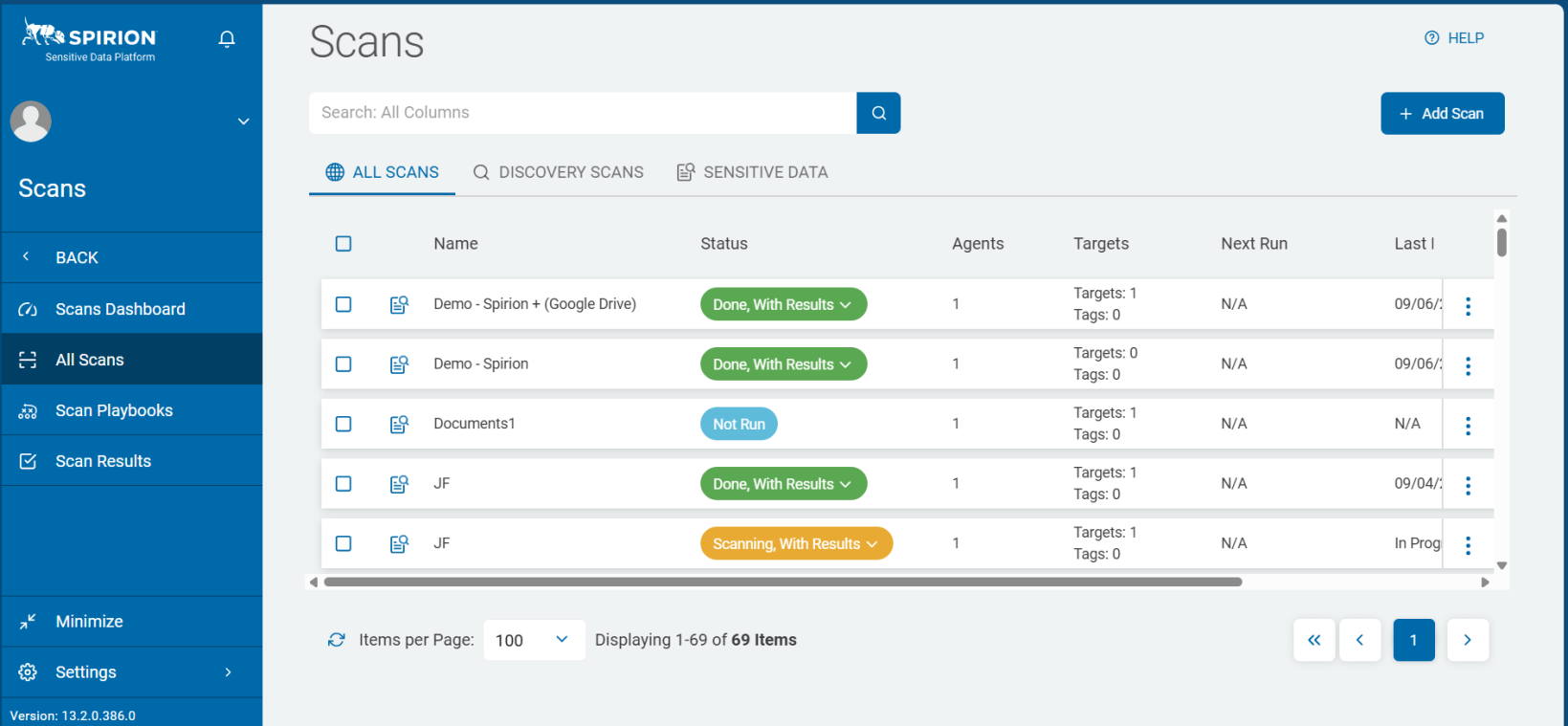 - Scans are the searches that agents perform on endpoints (targets) such as laptops, desktops, servers, databases, cloud locations, etc. to find either the file locations (Discovery Scan) or find specific data types (Sensitive Data Scan) within the files and folders