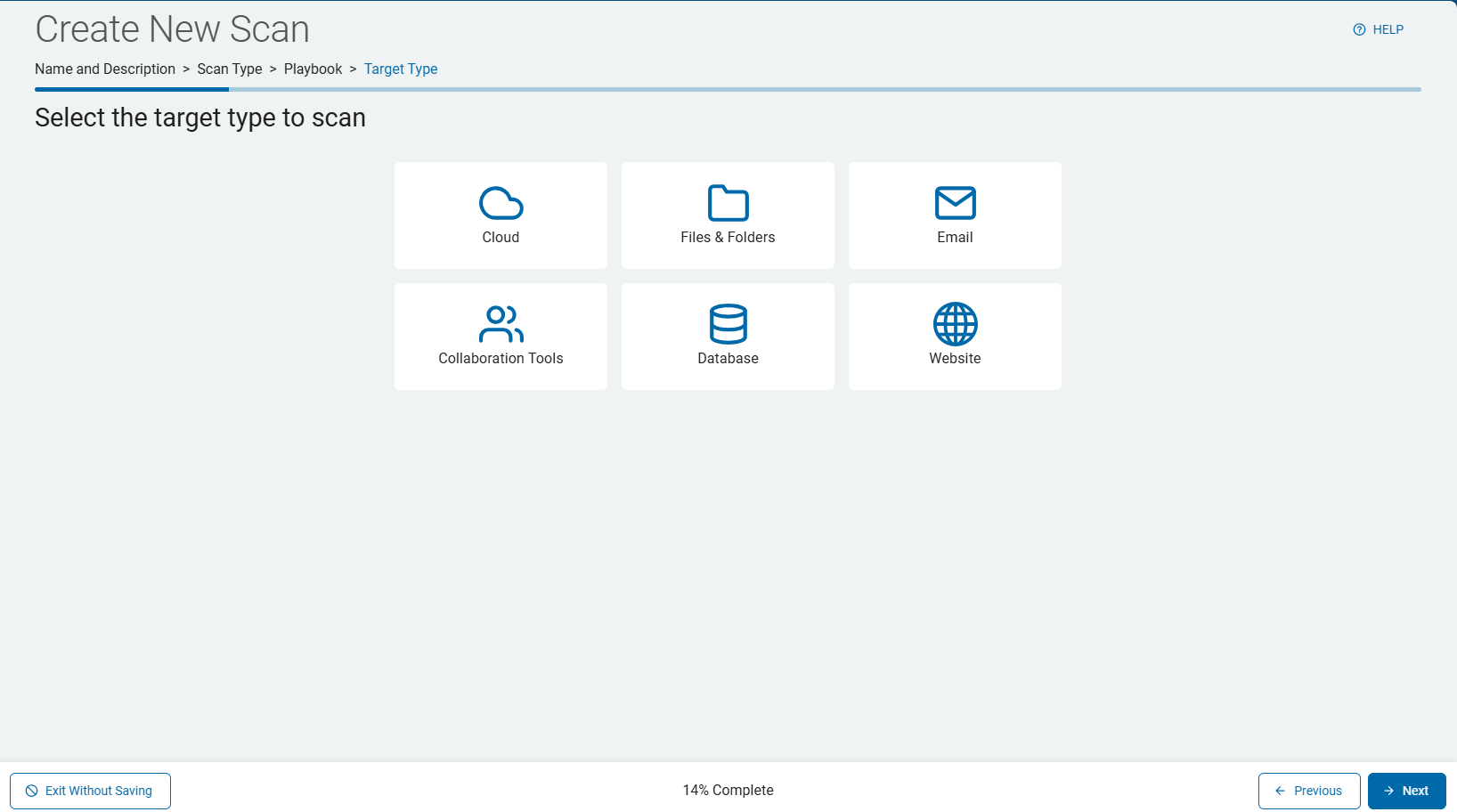 In the following topics, note that the steps for configuring each Target type (Cloud, Files & Folders, Email, Collaboration Tools, Database, Website) are similar, but each Target type has unique settings not shared by other Target types.