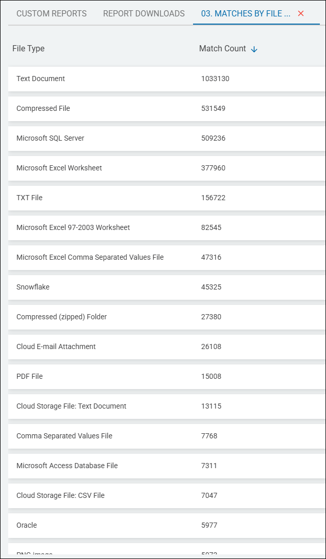 The Matches by File Type report provides a total of all sensitive data matches by file type: Text document, compressed file, Microsoft SQL Server, Microsoft Excel Worksheet, CSV, Snowflake, cloud e-mail attachment, PDF file, Microsoft Access database file, Oracle, etc.