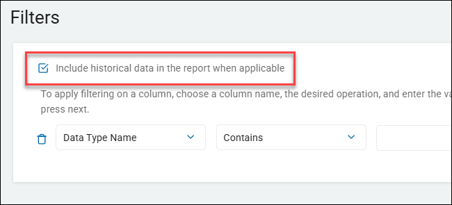 Optional. While no filters are configured for this scan, by default, in the example below the checkbox "Include historical data in the report when applicable" is checked.
