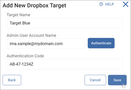 - In the "Add New Dropbox Target" pop-up window enter the following information: