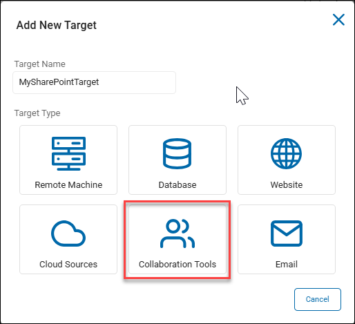 - In the Add New Target pop-up window, select the SharePoint/SharePoint Online tile.