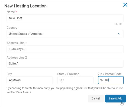 - Hosting Locations: Name of the location where the asset is hosted. Example: Tampa data center