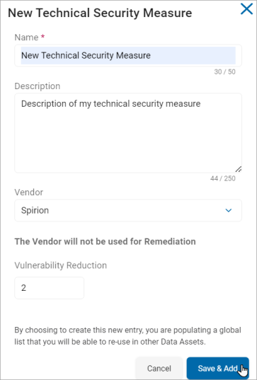 - Vulnerability Reduction: Assign a vulnerability reduction value to the security measure.