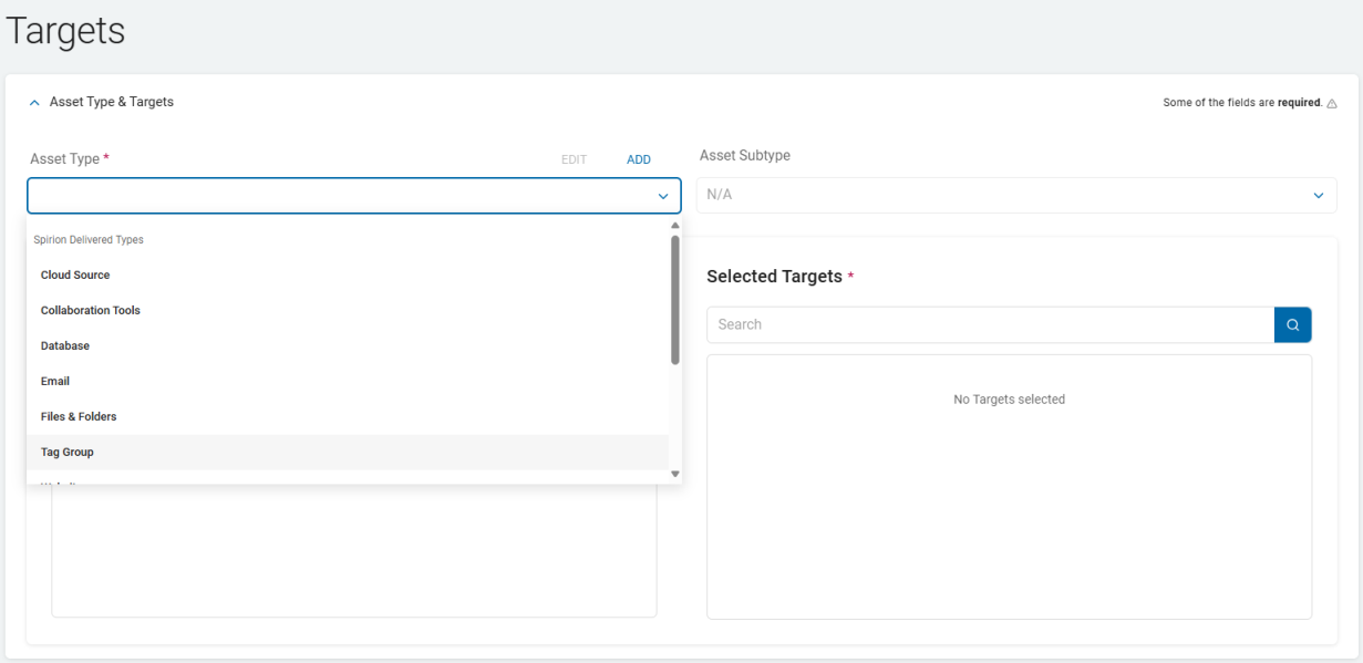The tab allows you to select the Targets and the Asset Type.