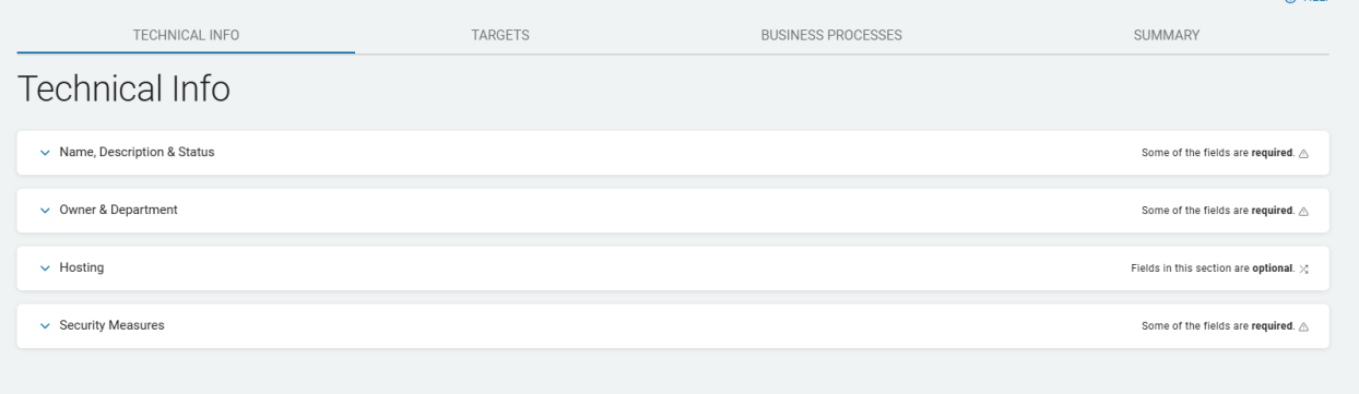 - This screen is one of 4 tabs: Technical Info, Targets, Business processes, and Summary.
