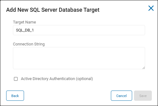 - When you select a SQL database, the Add New SQL Database Target window enables you to select the option Active Directory Authentication (optional).