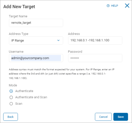 This topic describes how to add a remote machine Target by address, such as NETBIOS Name, IP Address, IP Wildcard, IP Range, or FQDN.