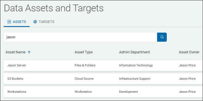- Example 2: Entering the name "Jason" reveals all assets that contain the term "Jason," which appears in both the Asset Name and Asset Owner columns.