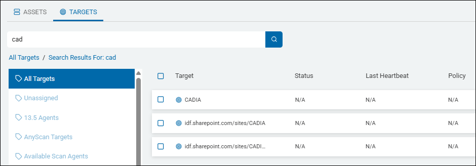 This topic gives details about the Targets tab on the page Data Assets and Targets in Spirion Sensitive Data Platform. This topic describes how to view Target details, how to Search for a Target, and the available Target types.
