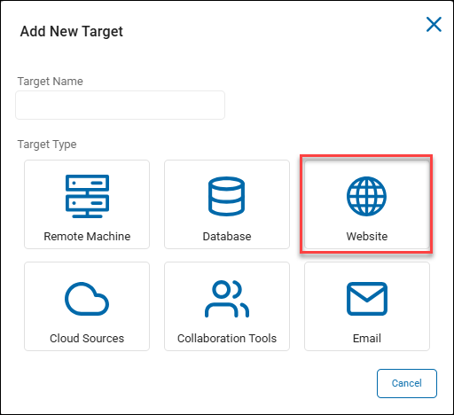 - Target Name: In the "Add New Target" pop-up window, enter the name of the Target in the "Target Name" field. Make the name descriptive by including identifiers such as the website name, hostname, location, department, status, and/or date.