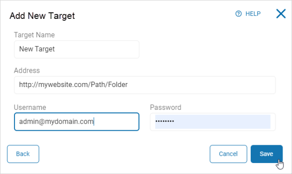 - In the "Add New Target: pop-up window, enter the following information: