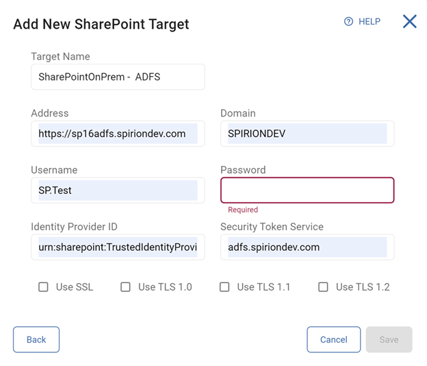 - Complete the following fields in the “Add New SharePoint Target” pop-up (shown below, after step "d." with sample values).