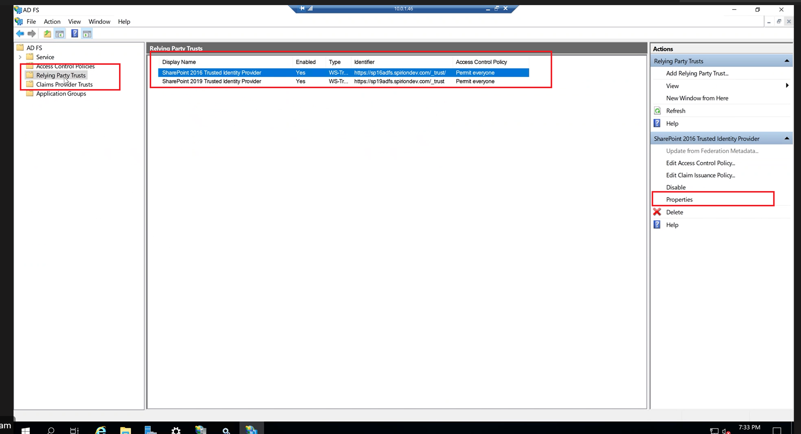 - Click the ‘Relying Party Trusts’ folder