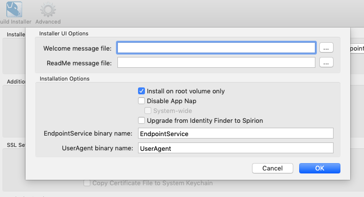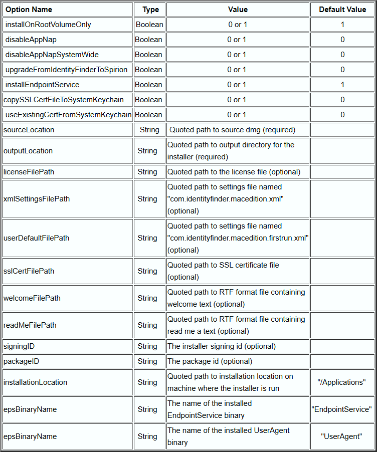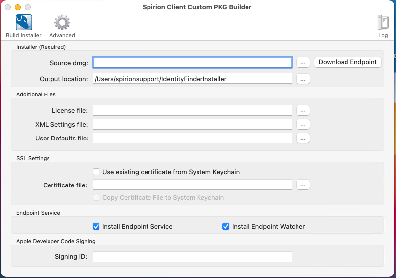 "/Applications/Identity Finder Client Custom PKG Builder.app/Contents/MacOS/Identity Finder Client Custom PKG Builder" -sourceLocation "/Users/macuser/Downloads/IdentityFinderMacSetup.dmg" -outputLocation "/Users/macuser/IdentityFinderInstaller" -licenseFilePath "/Users/macuser/Downloads/identityfinder.lic" -xmlSettingsFilePath "/Users/macuser/Downloads/com.identityfinder.macedition.xml" -signingID "Acme Development, LLC"Notes for Command Line Installation Use