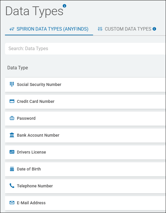 - Which data types are provided - Spirion data types (Social Security number, credit card number, phone number, etc.)?