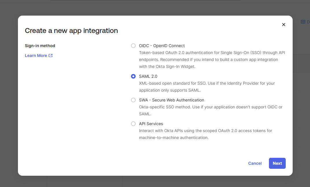 - Select the SAML 2.0 radio button from the list in the pop-up menu.