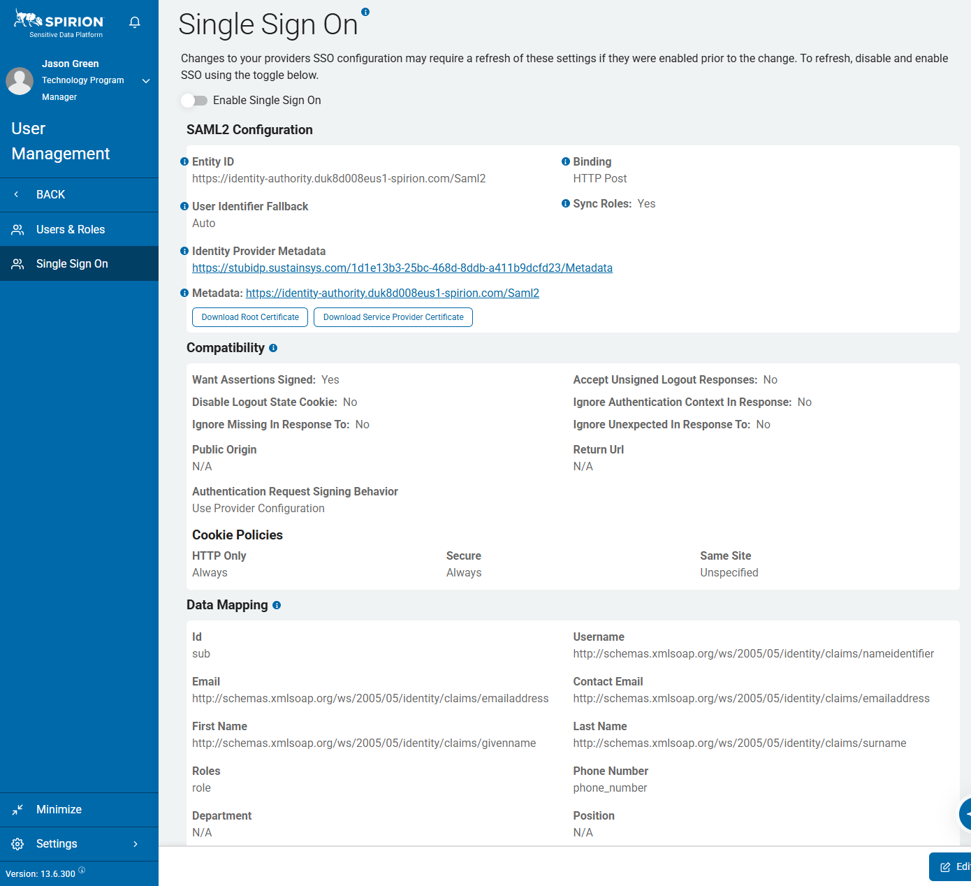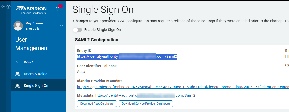 - In Spirion Sensitive Data Platform, in the blue navigation menu on the left side of the page, navigate to Settings > User Management > Single Sign On.