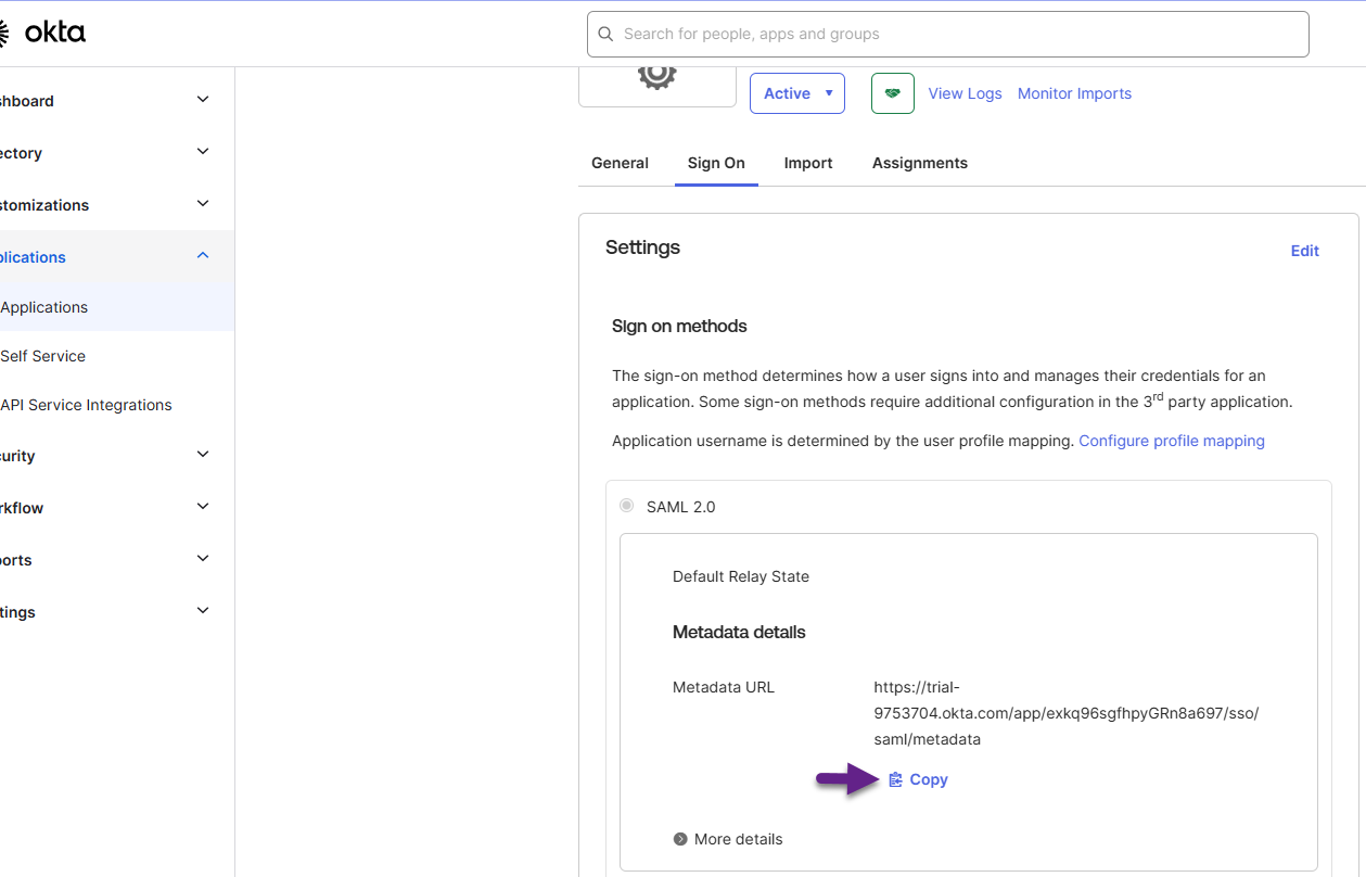 - Click the blue Copy link under the Metadata URL in the SAML 2.0 box under Settings.