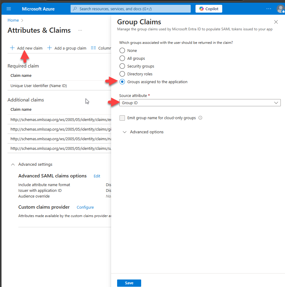 - Click the link + Add new claim at the top of the "Attributes and Claims" Azure page.
