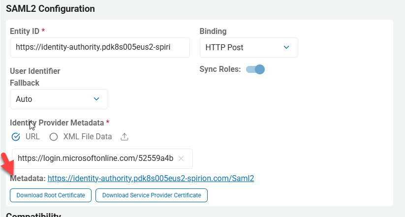 - On the Spirion console click the blue URL next to Metadata: in the SAML2 Configuration section.