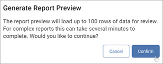 Note: The report preview loads up to 100 rows of data for review. For complex reports this can take several minutes to complete.