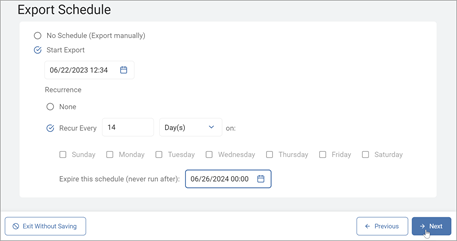 - Choose to schedule the export or manually export (immediate export):