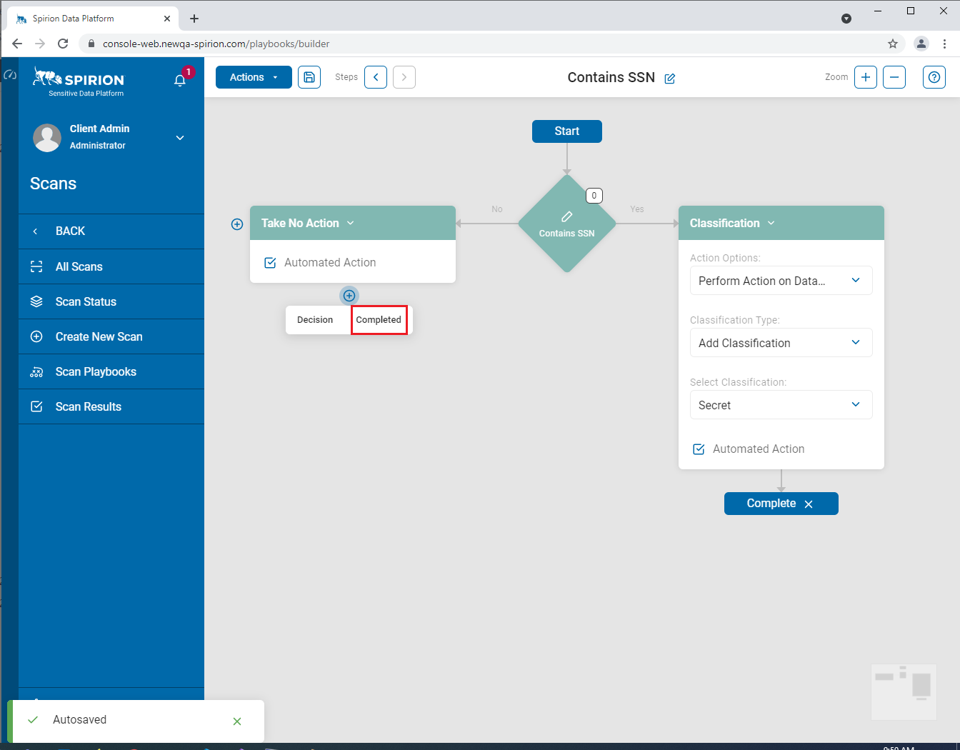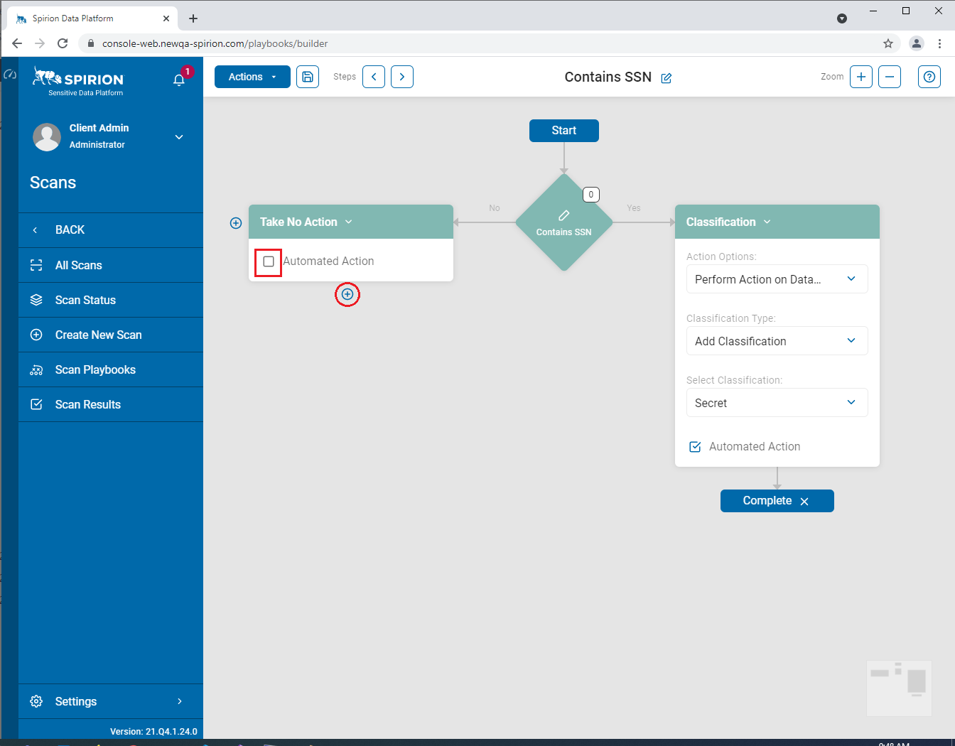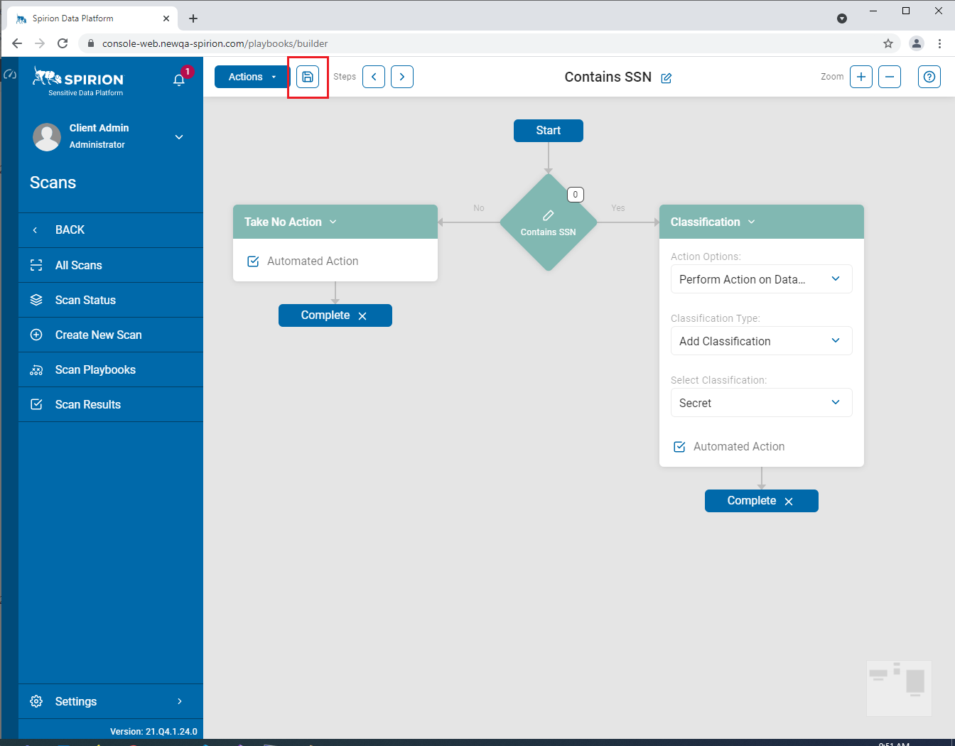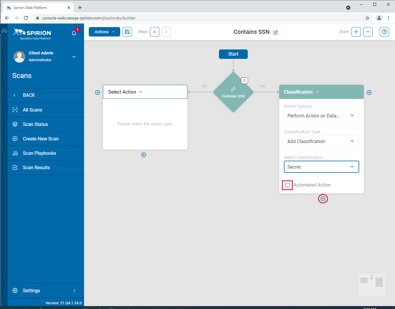 Recall that Scan Playbooks are a kind of decision tree which instruct Spirion Sensitive Data Platform on what to do during scans, such as quarantine, shred, or redact sensitive data. For more information about Scan Playbooks, see How to Add a New Scan Playbook.