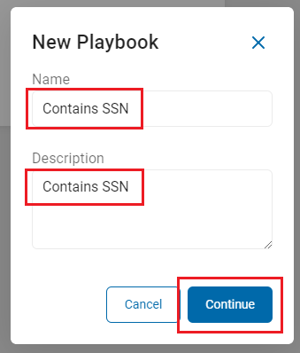 - The New Playbook dialog appears. Enter a Name and Description for the new playbook and select the blue Continue button.