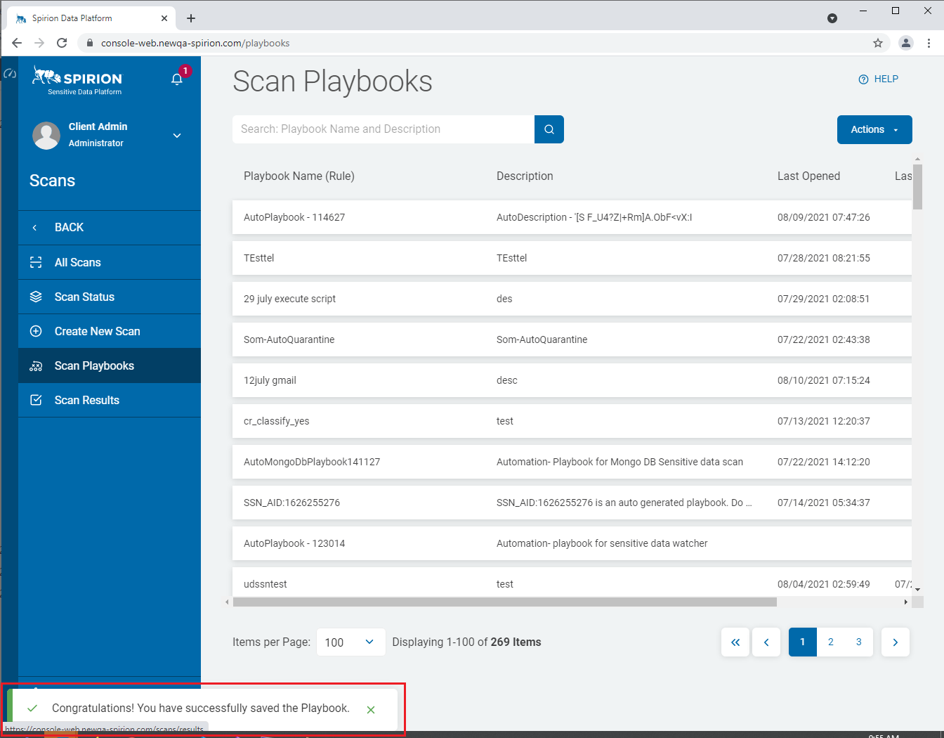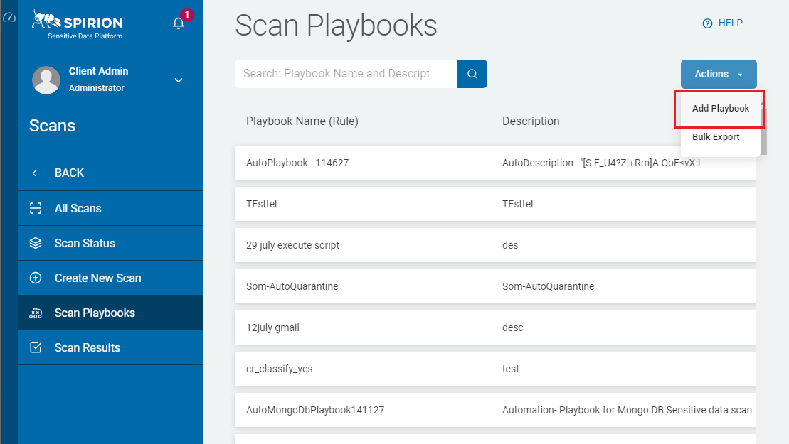 - Log in to Spirion Sensitive Data Platform with a user account that is a member of a role which contains the permission "Create Playbooks" (see How to Add a New Role for info about creating a new user role):