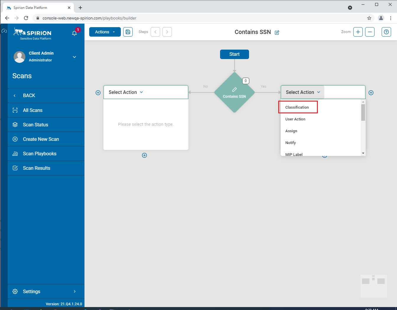 Note: At least one "Classification" or "Shred" action must be set in a playbook (on either the "Yes" or "No" path). - On the Yes branch, click the Select Action drop-down menu and choose Classification from the list of options.