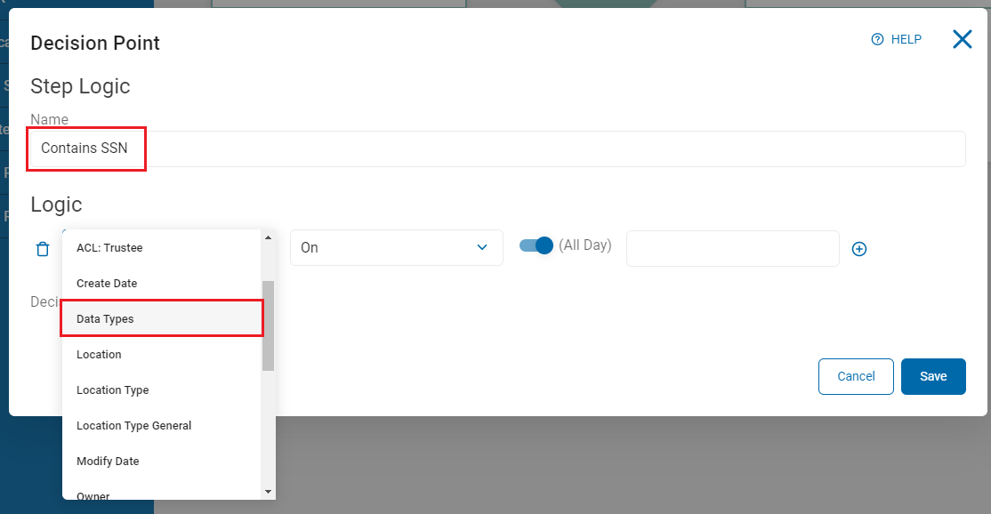 - On the Decision Point dialog, enter a descriptive name for this decision point, such as "Contains SSN," and select Data Types in the drop-down menu.
