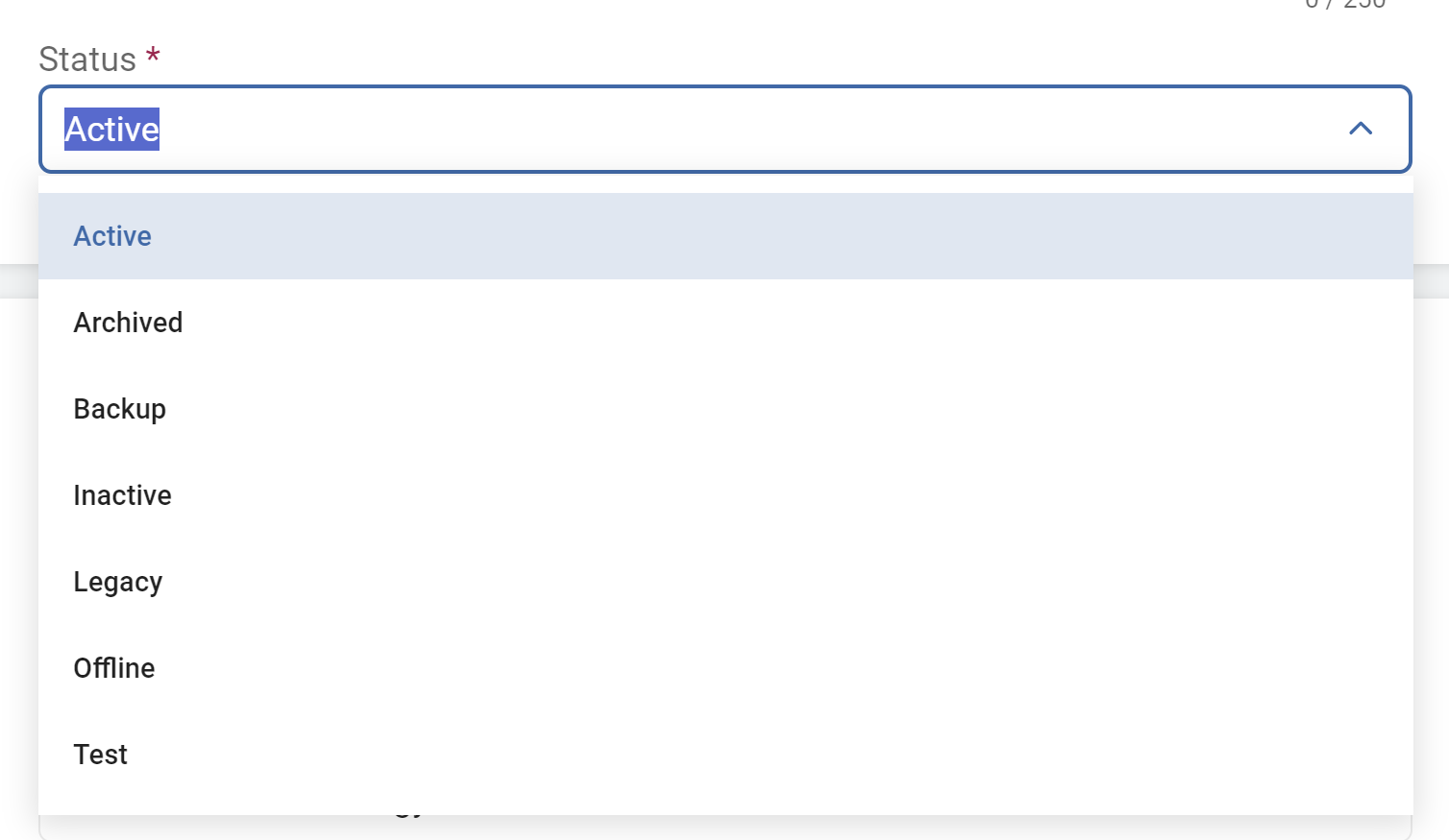 - Active, Archived, Backup, Inactive, Legacy, Offline, Test