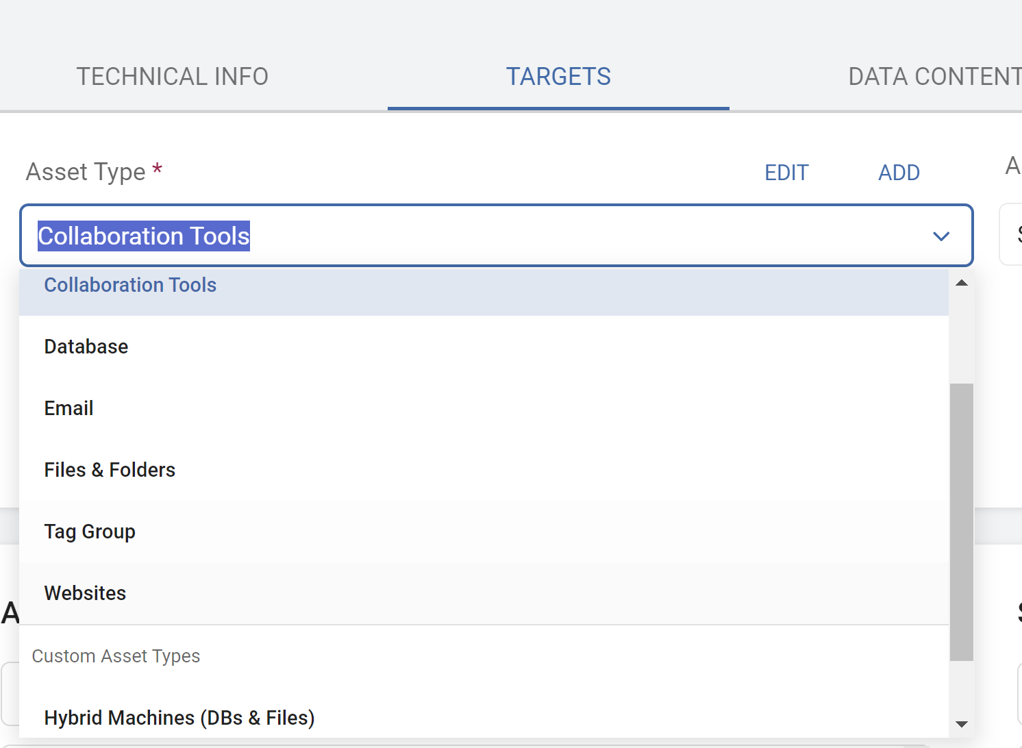 - Asset: an Asset or Data Asset is a location, local, or remote (such as cloud-based), that contains Targets (a Target is any data location inside an Asset that SDP can scan for sensitive data).