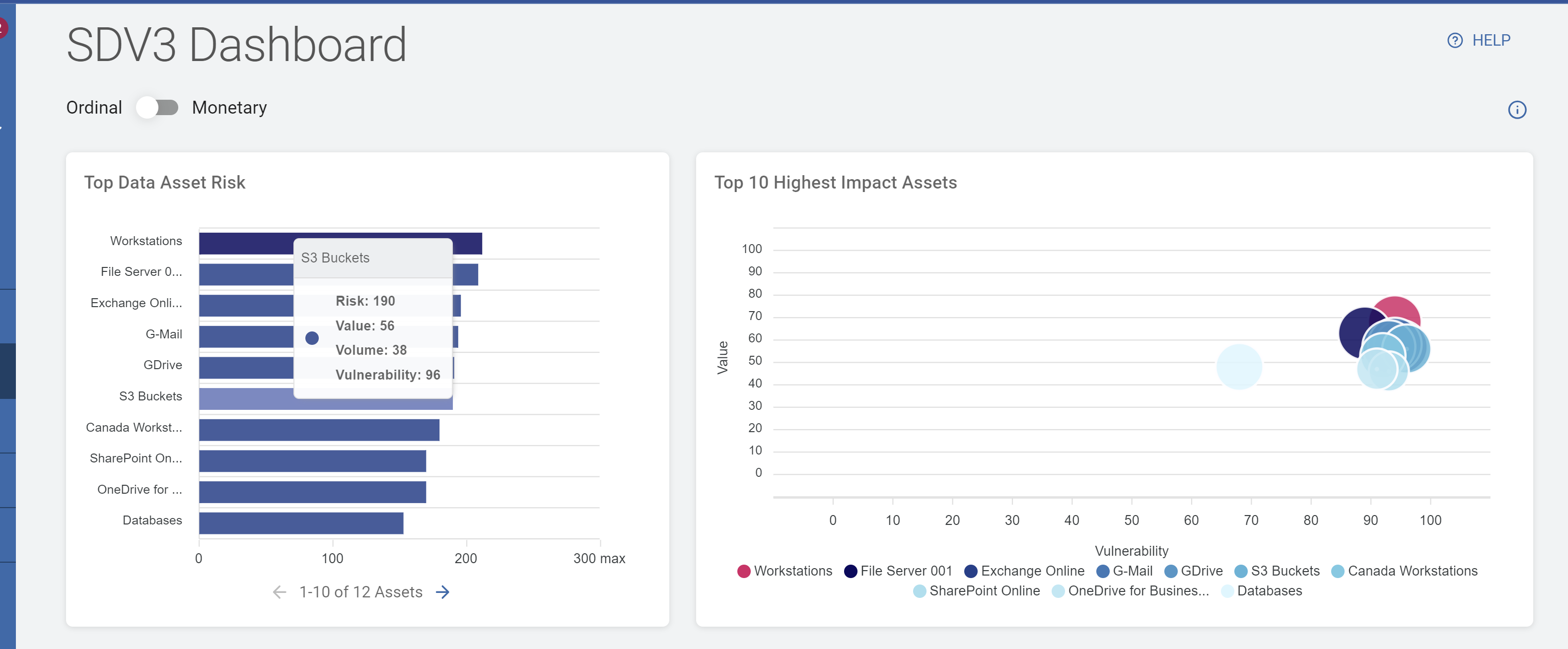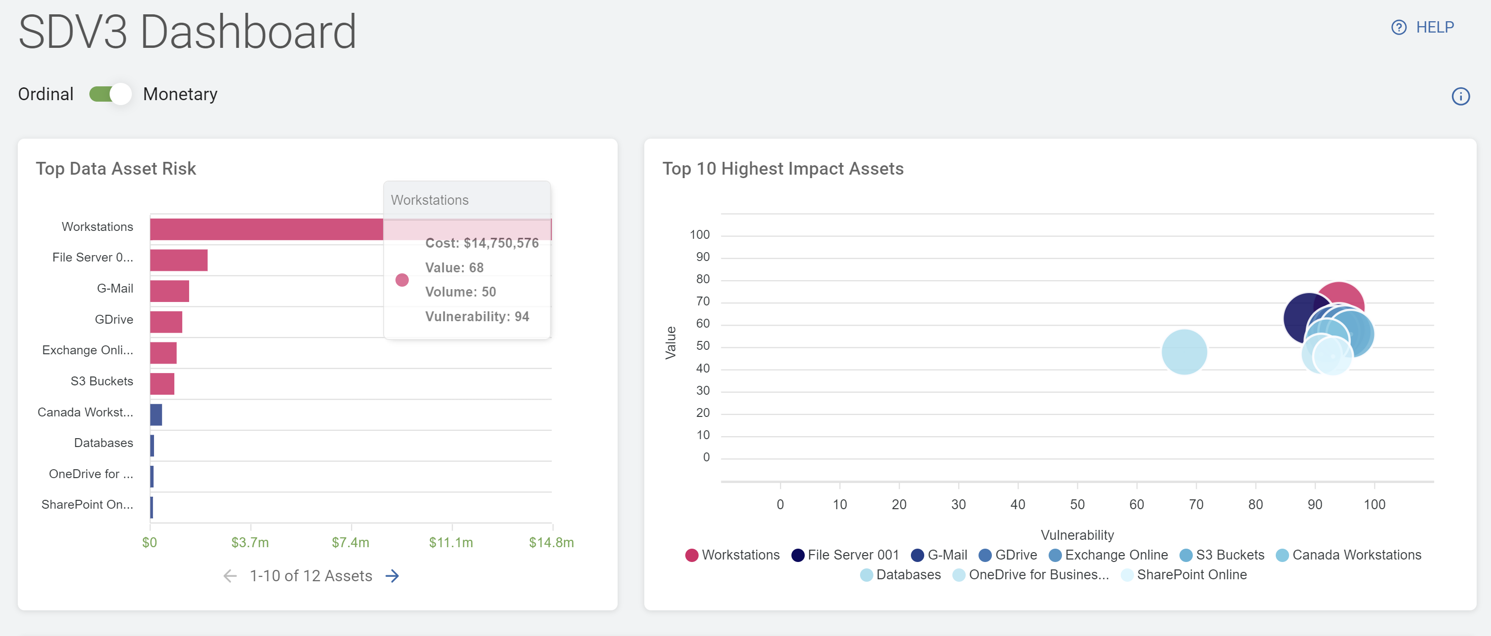 The SDV3 is a dashboard that shows the Value, Volume, and Vulnerability of the sensitive data (SSN, credit card numbers, etc.) in an asset.