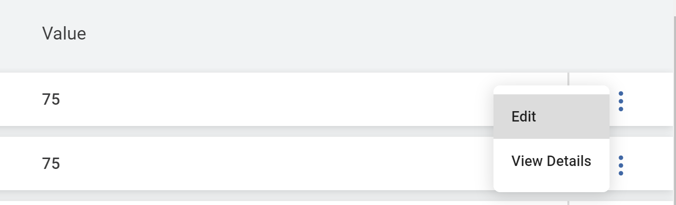 1. Edit the Value of a Data Type by clicking the kebab menu to Edit.