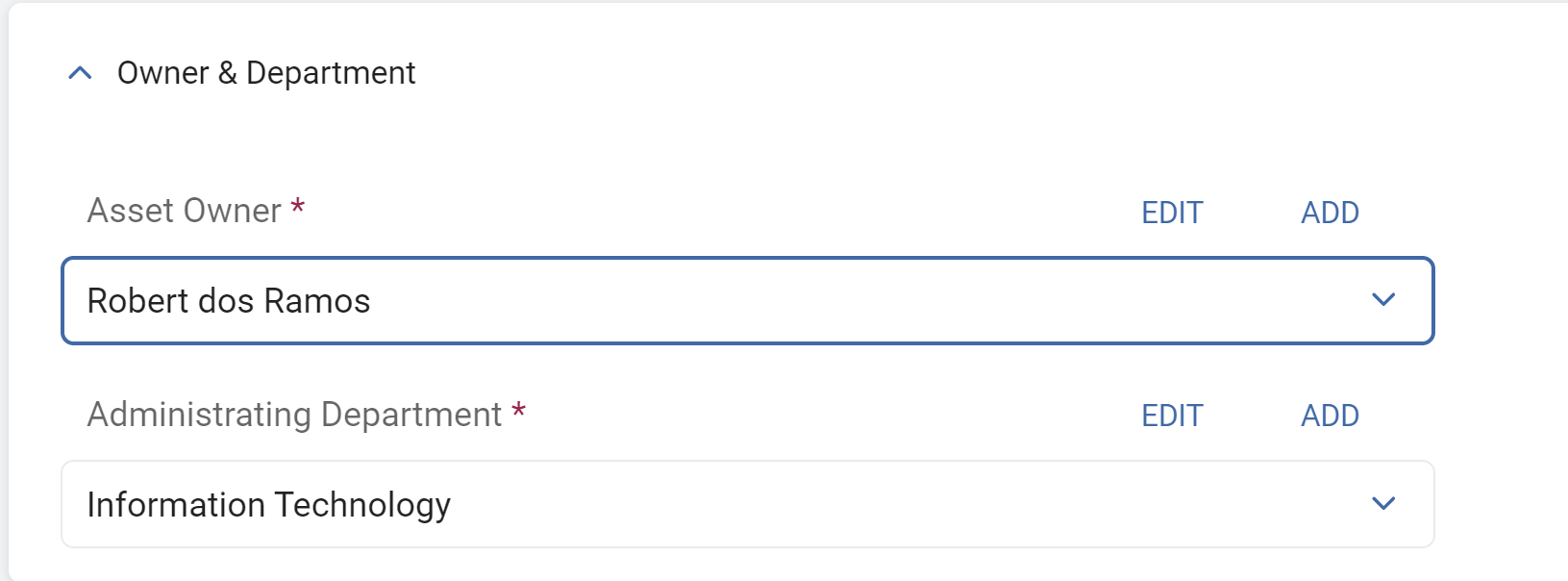 - Asset Type - Choose from a list of built-in Asset Types or Add a Custom Asset Type