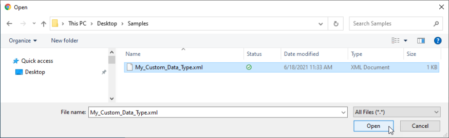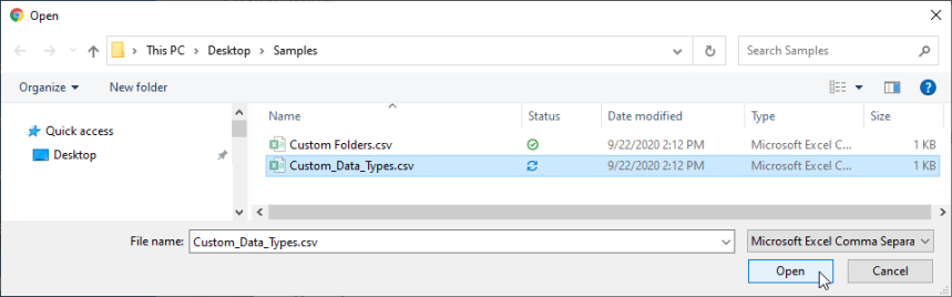 - Locate and select the .csv file on your local computer. Click the Open button.