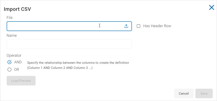 - In the Import CSV pop-up window, click the "File" field to launch the file Open dialog (shown after step 6 below).
