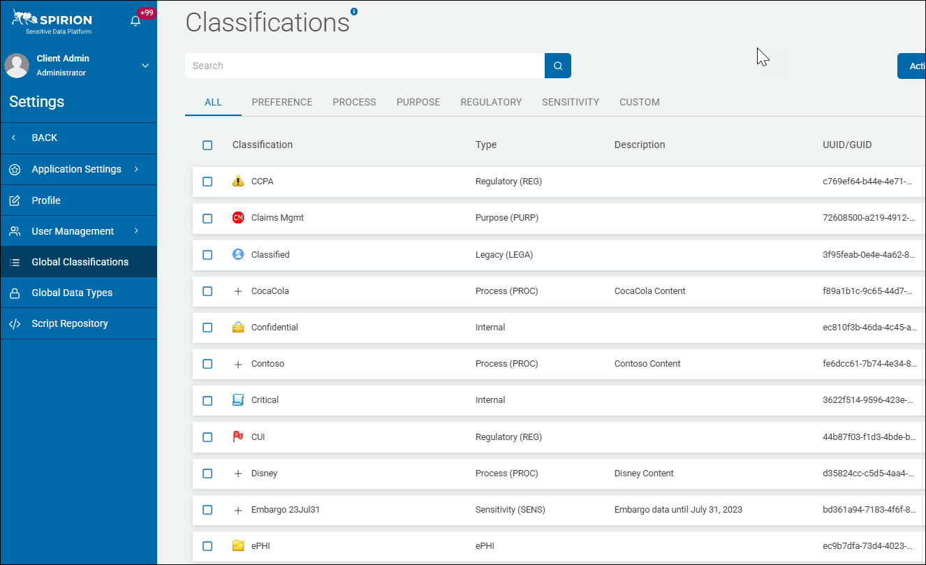 The Classification page in Spirion Sensitive Data Platform displays a searchable list of existing classifications.