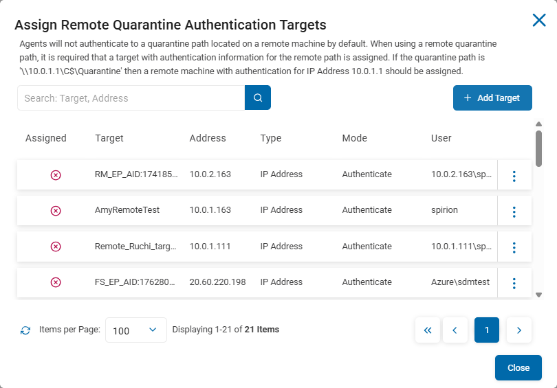 - Note: If you create the Target on this screen, the Target address must be in the same format as the Windows quarantine path. That is, if you put an address in the Windows Quarantine file path that uses a NetBIOS in the UNC path then the Target created must also use NetBIOS.