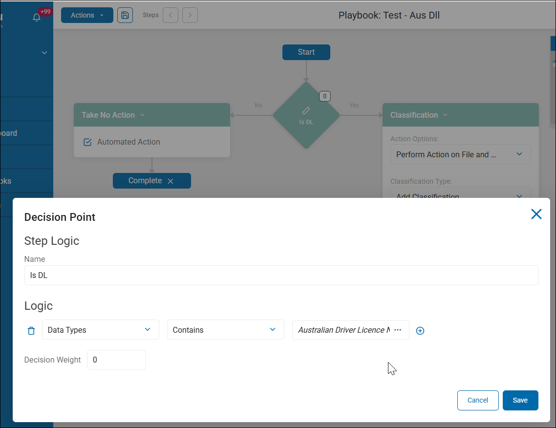 - For example, when you create a Scan Playbook you can create rules (step logic) which takes action on the SearchAPI data type you created. In the example below, the SearchAPI data type "Australian Driver License Number" is set to be classified (at the file and databse level) when discovered by scans that use this playbook.