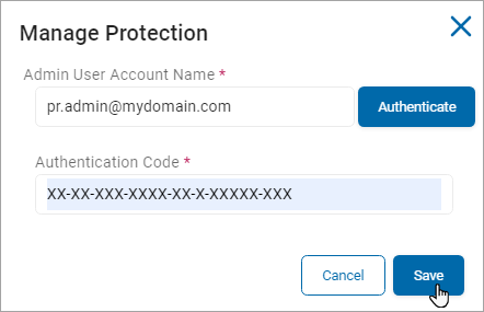 - Enter your admin user account name (user@domain.com) in the field Admin User Account Name and click the blue Authenticate button.