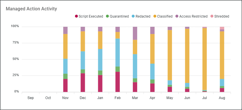 The "Managed Action Activity" bar graph shows the various managed actions (as a percent (%)) performed on sensitive data matches over time (by month).