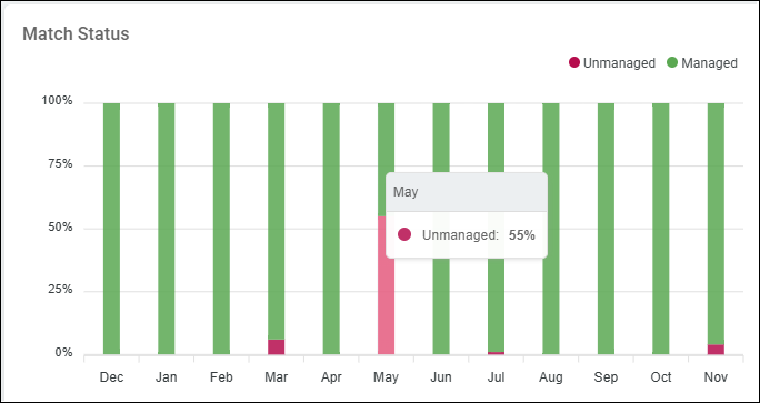 The Match Status bar graph shows what percent (%) of scanned content is stored on Managed vs Unmanaged sources over time (by month).