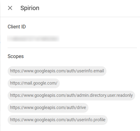 https://www.googleapis.com/auth/userinfo.emailhttps://www.googleapis.com/auth/userinfo.profilehttps://www.googleapis.com/auth/admin.directory.user.readonlyhttps://www.googleapis.com/auth/drivehttps://mail.google.com - Save your changes.